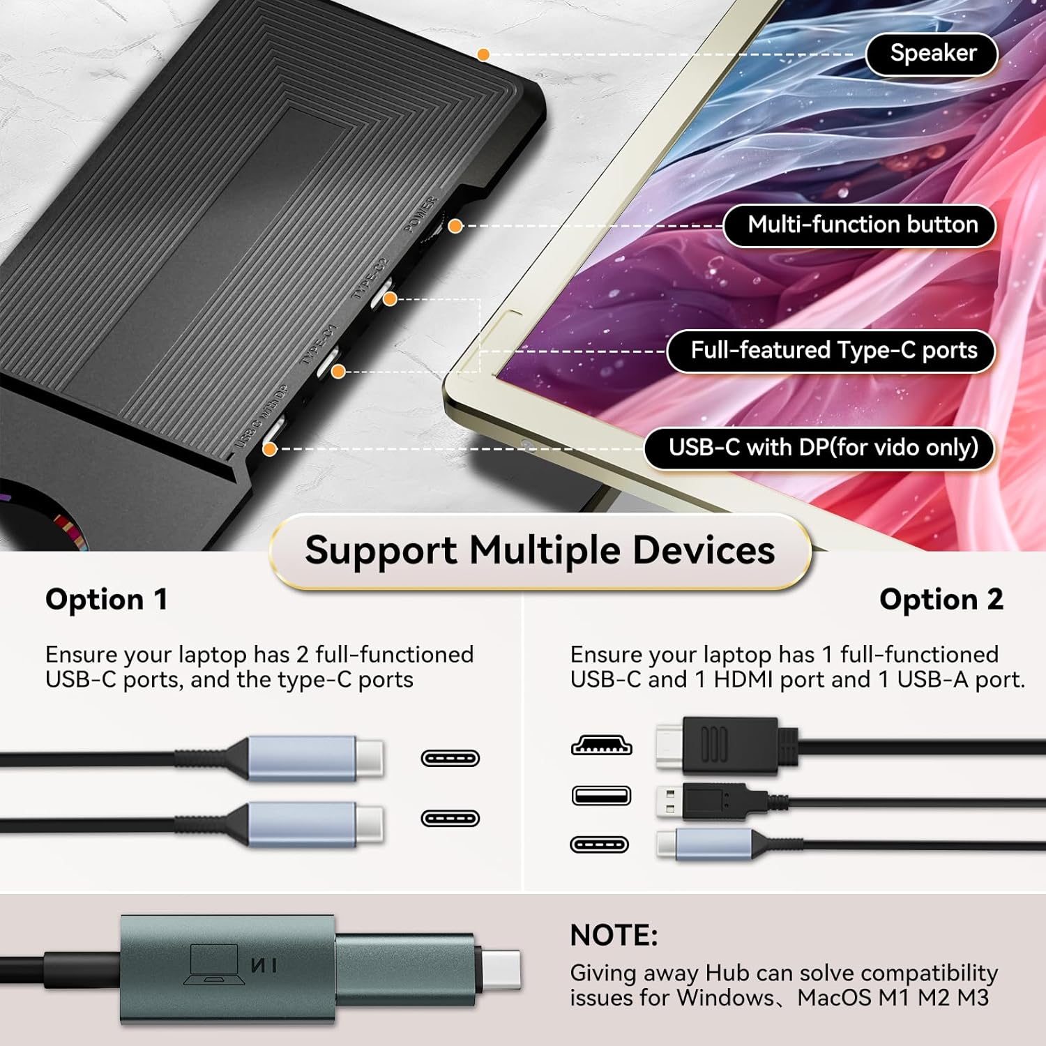 - [Supports Multiple Devices]: Plug and Play Equipped with HDMI/USB-C/Type-C/Hub, special customized hub included (converts USB-A/Type-C transport port on laptop to video port). Compatible with Windows, macOS , Chrome, Dex, Xbox, Switch, PS5.The Domyfan S6 Portable Monitor eliminates the need to clip the monitor to your laptop, enhancing protection against potential laptop damage and fits laptops of all sizes.