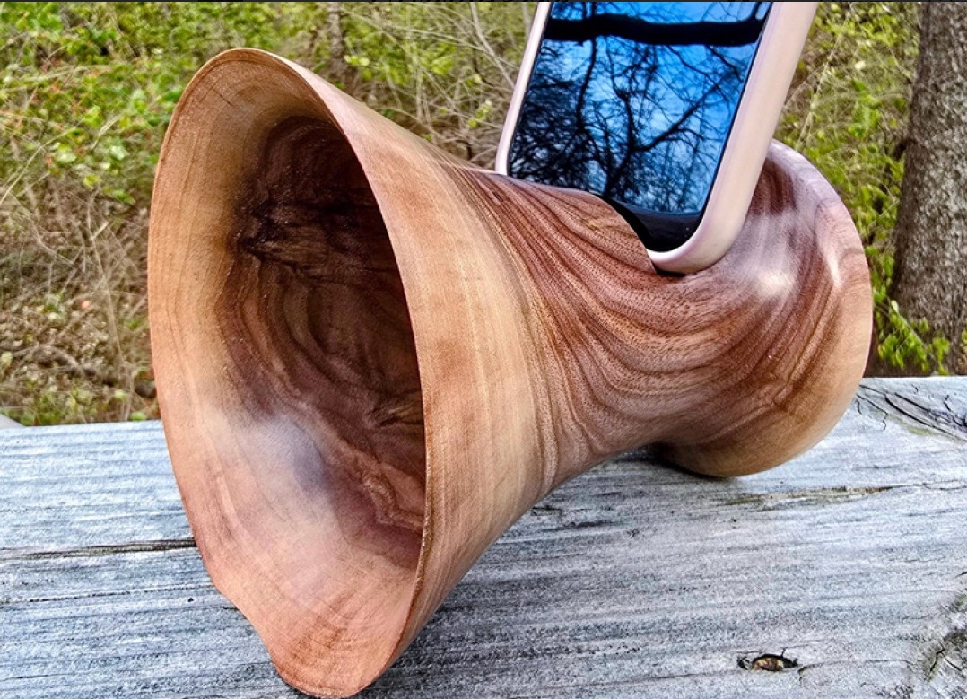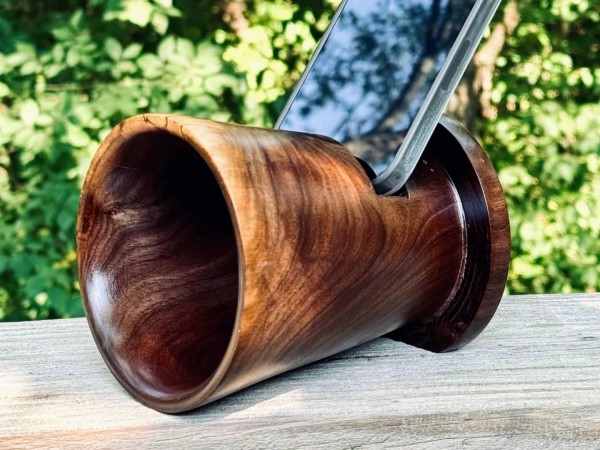 This one of a kind handmade phone amplifier stand holds your phone and amplifies the audio coming out of your phone's speaker using the acoustics of the shape of the wood.